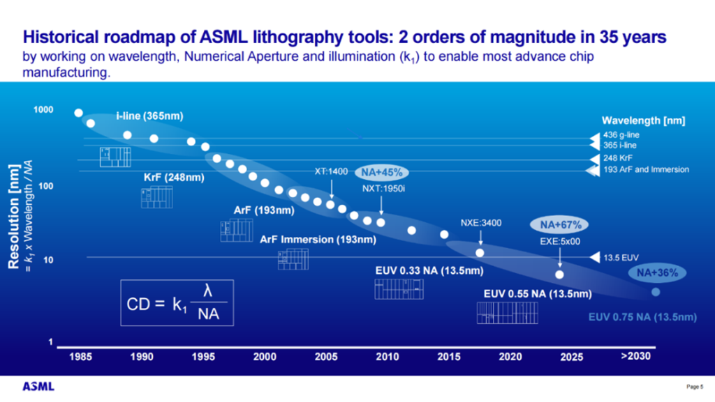 • ASML 光刻技术演进:35 年内通过波长缩短(i-line→KrF→ArF→EUV)、数值孔径(NA)提升和照明优化,实现两数量级分辨率提升。
