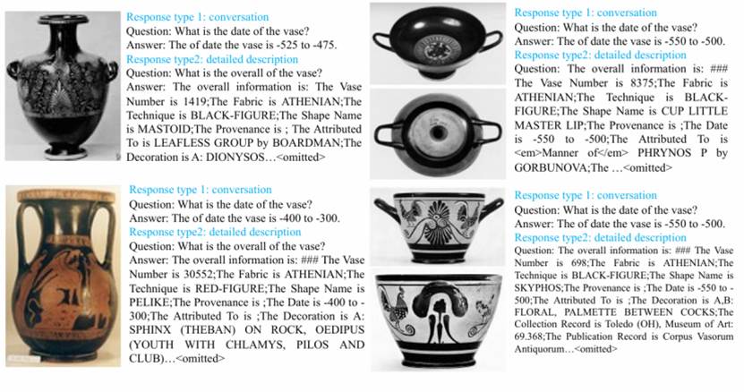在多模态大语言模型广泛应用的背景下,文化遗产领域仍然缺乏专门的数据集。为弥补这一空缺,我们联合多所考古研究机构、博物馆和古希腊文化专家,共同构建了VaseVQA数据集。该数据集围绕古希腊陶器这一重要的文化载体,收集了31 773张多视图和单视图图像,并配套了93 544条视觉问答对。为了方便科研使用,我们按照训练集和测试集划分,并在每张图像上设计八种属性问题(材质、技法、形状、产地、年代、归属、装饰和整体描述),以全面覆盖从简单事实到复杂推理的需求。数据收集过程中,我们不仅采集完整陶器,还包含器物碎片及其埋藏环境的照片,确保视觉样本体现器物材料、工艺及区域差异;文本部分则来源于学术论文、考古报告和专家注释,涵盖了陶器的材质、纹饰、考古场景等,并经过翻译整理以适配视觉问答任务。