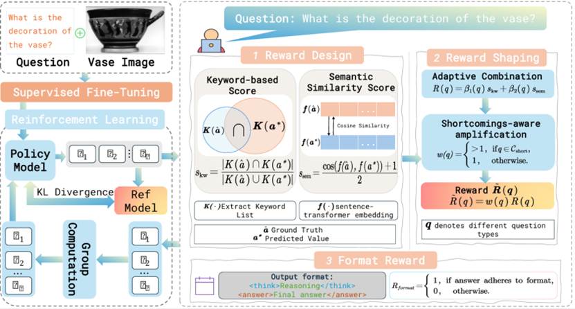 我们构建了VaseVQA,一个专注于古希腊陶器的大规模视觉问答数据集。在该数据集上对多模态大语言模型(MLLMs)进行fine-tuning,我们采用SFT-then-RL的训练范式,并提出“诊断式”奖励机制,将SFT评估结果转为监督信号,以弥补MLLMs在薄弱任务类型上的推理能力缺陷。